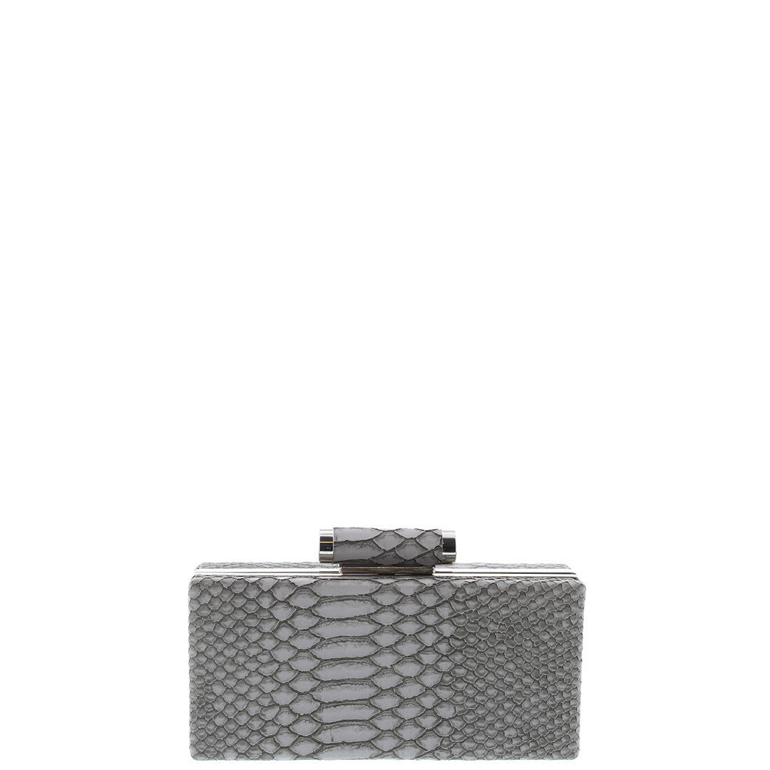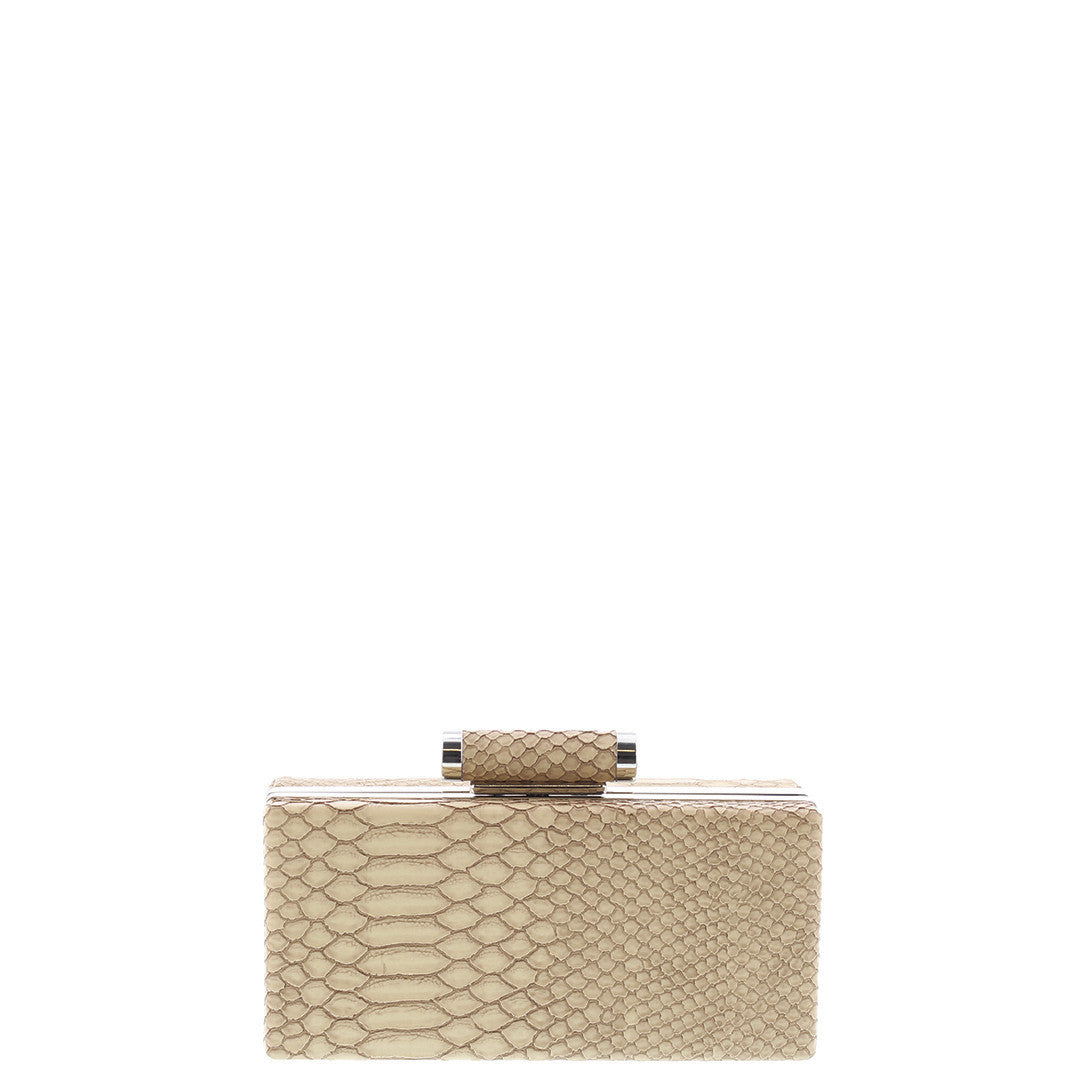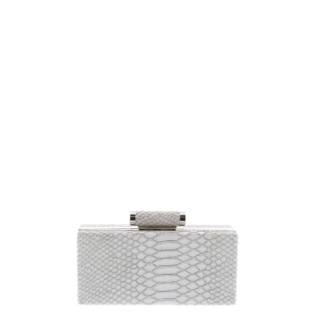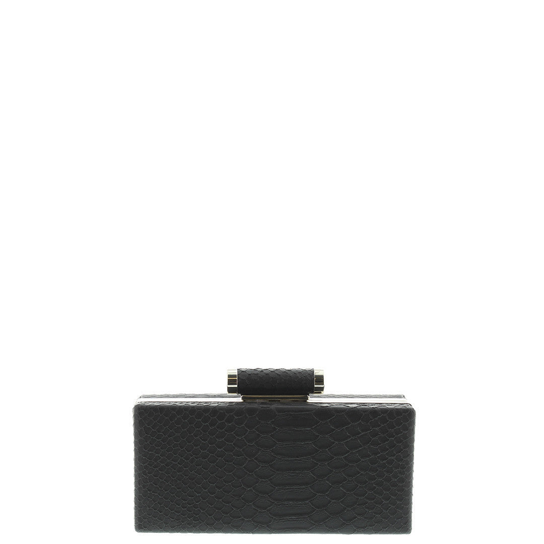 June Snake embossed leather box clutch is framed with metal sides and fastens securely with a leather-engraved clasp. This box will easily fit your smartphone and small essentials, use the optional chain strap to wear it on shoulder.