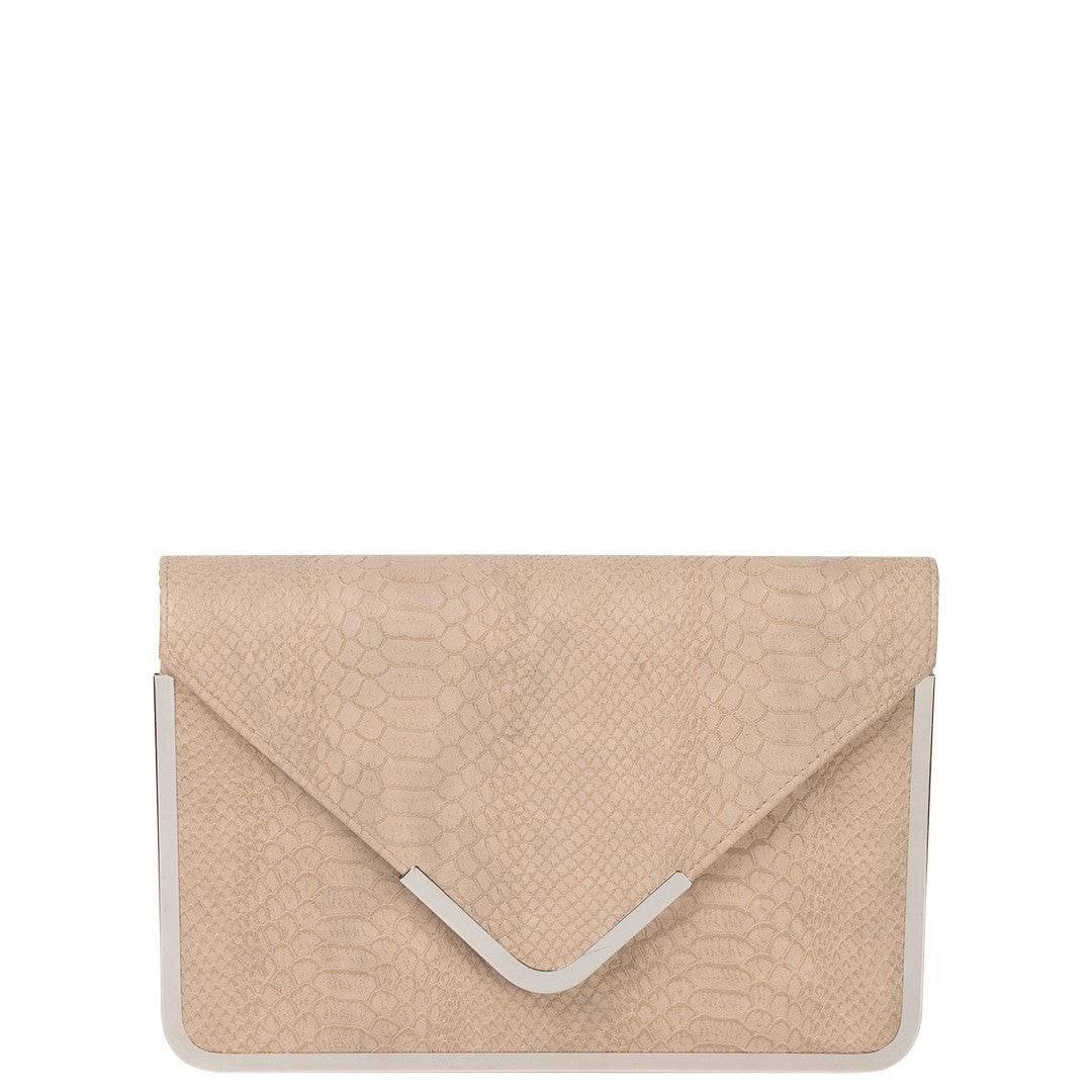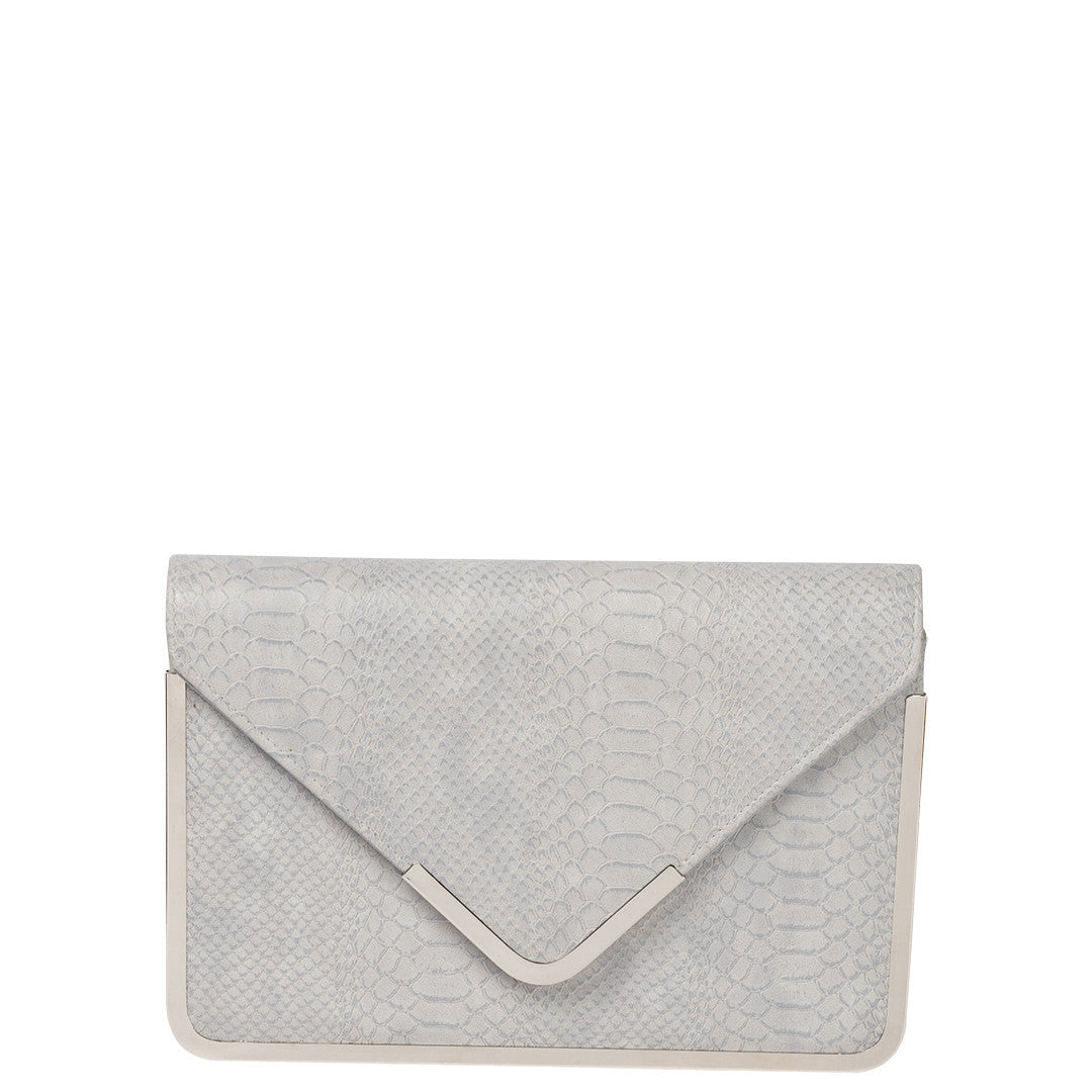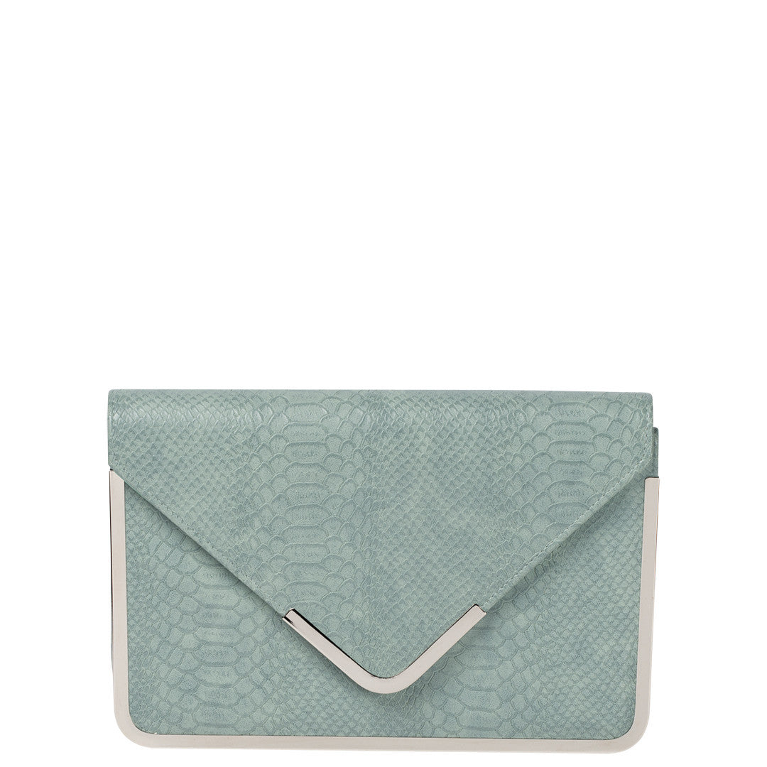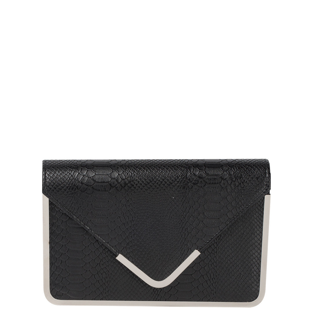 Kim is a leather, croc embossed envelop clutch with metallic band as trim detailing. Gorgeous on occasion or for those who desire a sophisticated accessory and comes with a shoulder chain strap.