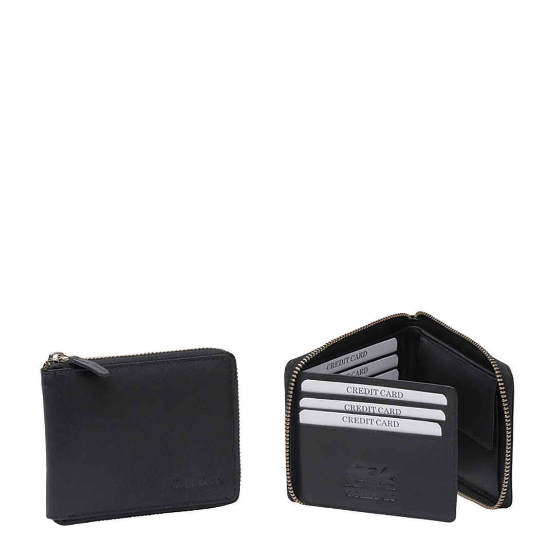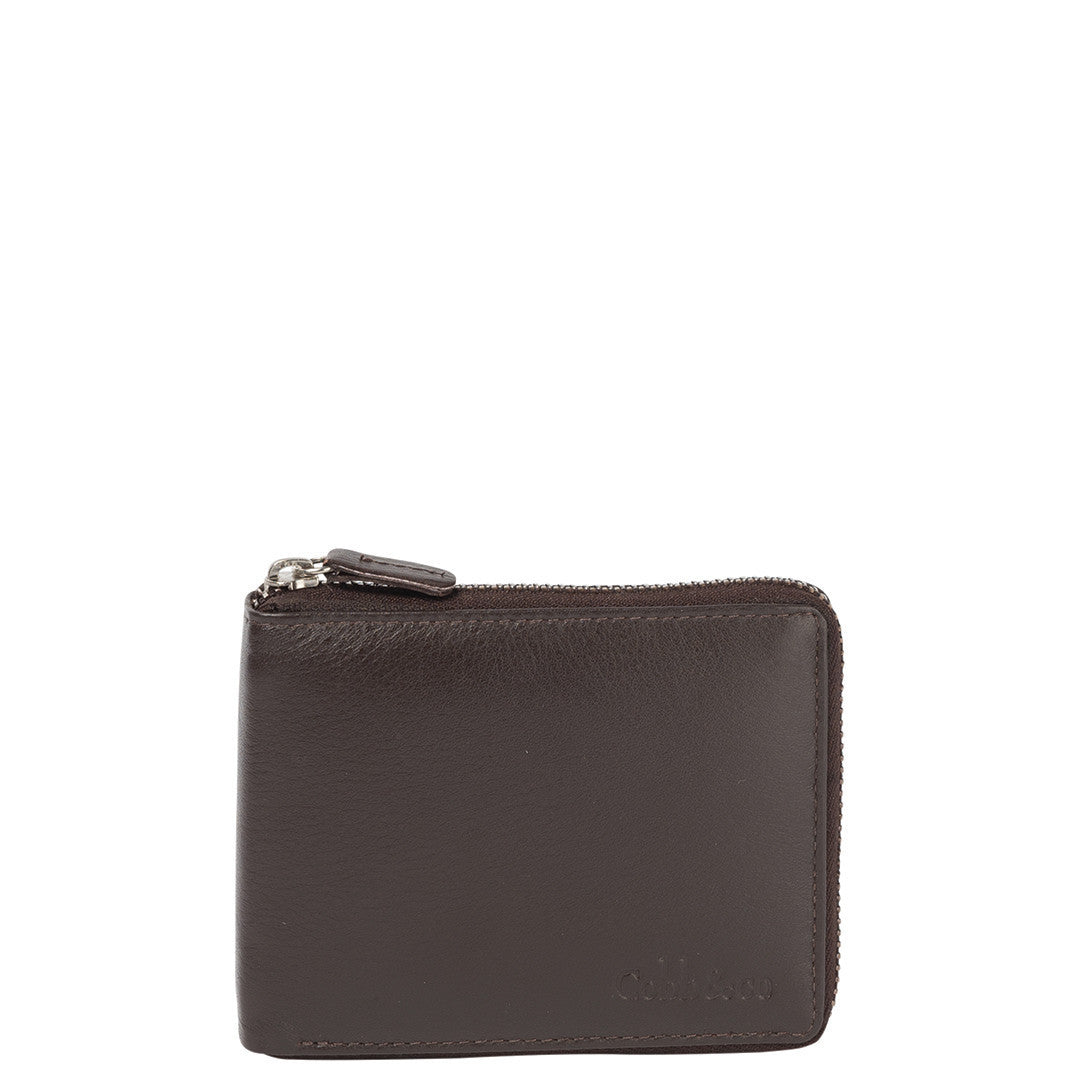 This leather men's three fold wallet features secure zip around closure, ample notes and receipts section, 8 credit card slots and an exterior transparent ID window. It is fully lined.