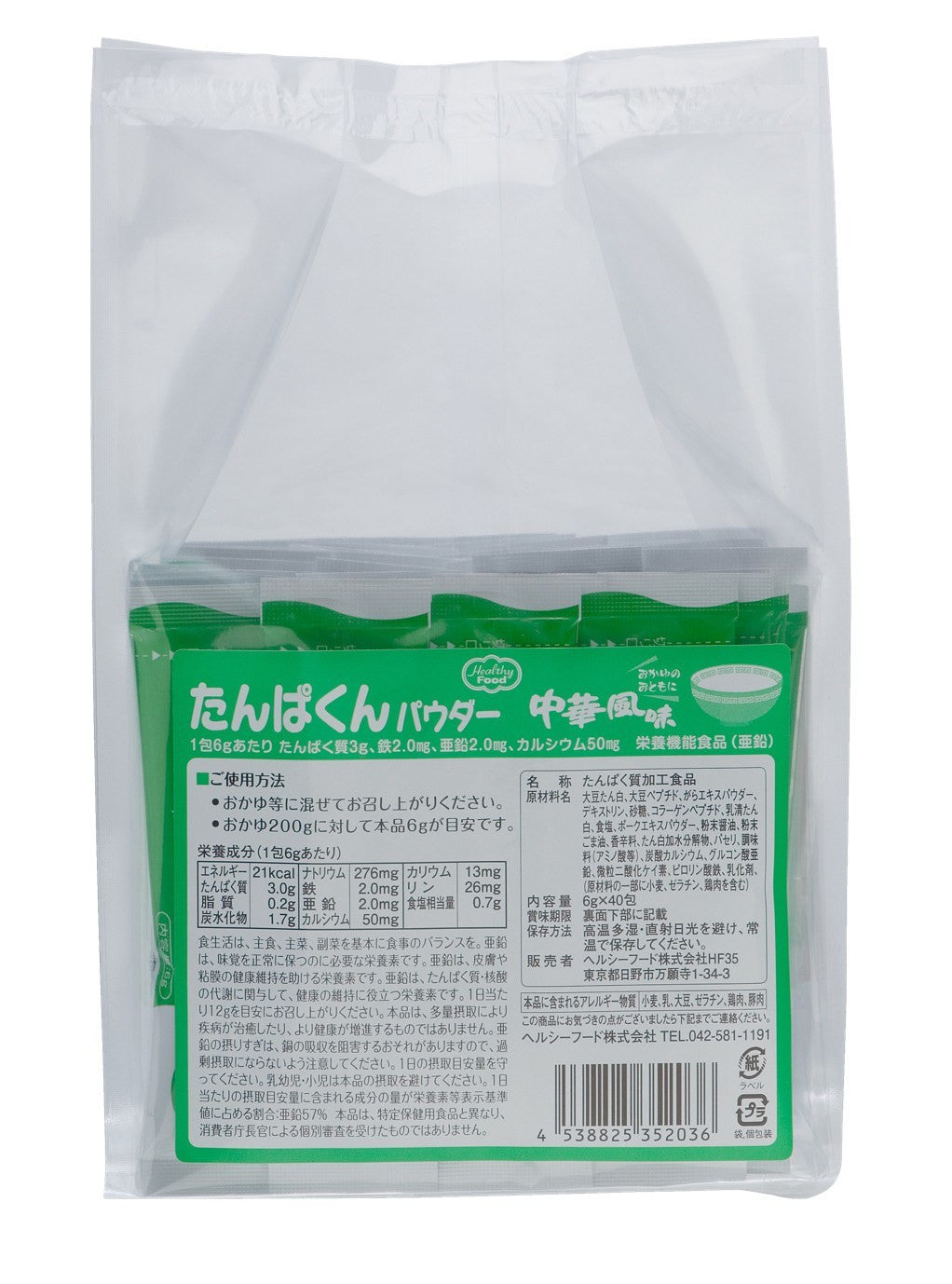 Soy protein, Soy peptide, White broth powder, Dextrin, Sugar, Collagen peptide, Whey protein (from milk), Salt, Pork extract powder, Flavourings, Sesame oil powder, Spices, Protein hydrolysate (Soybean, corn, wheat, yeast, sea water), Parsley, E170i, Zinc gluconate, E551, Ferric pyrophosphate, Emulsifier.